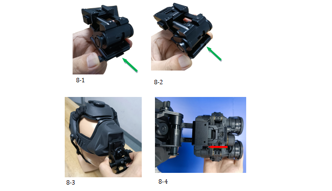 As shown in Fig.8-4, after the helmet mounting device is installed on the helmet, align the universal clamp of the night vision device with the device slot of the helmet mounting device by the eyepiece, and press the clamp inward until you hear a click. Then release the device. The night vision device is assembled. (Note: When removing the device from the helmet mounting device, press the button indicated by the oblique arrow in Fig.8-5 and pull out the night vision device, as shown by the arrow in Fig.8-5.)